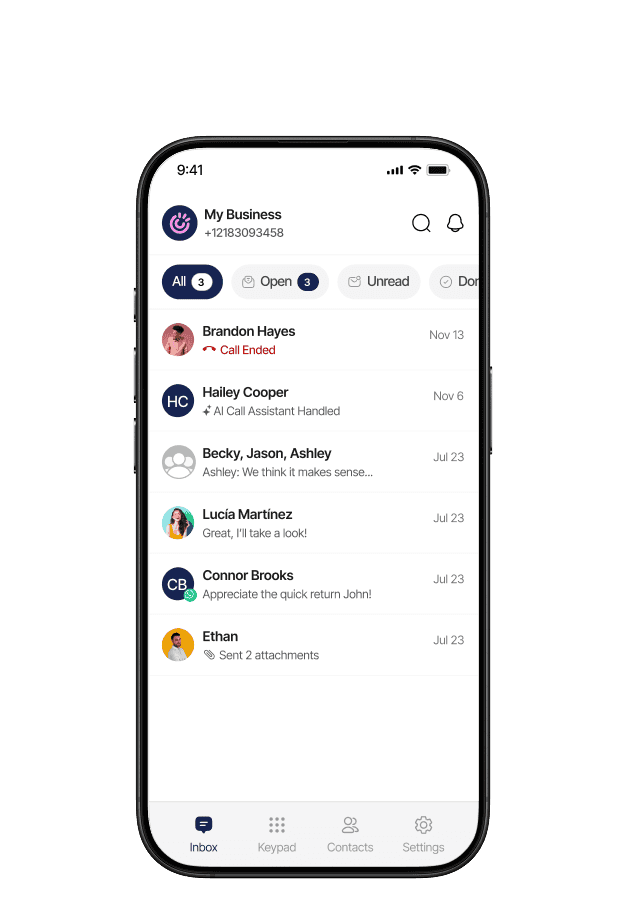 A unified inbox brings calls, SMS, and WhatsApp conversations together in one thread, allowing your team to view the entire communication history with a customer in one place.